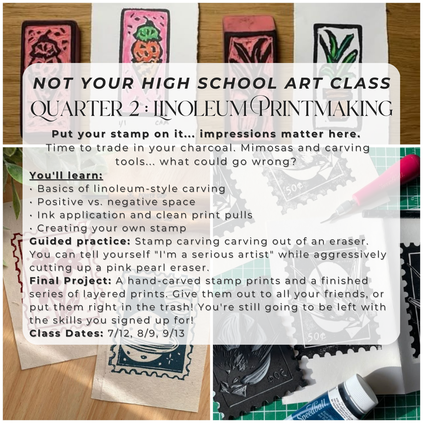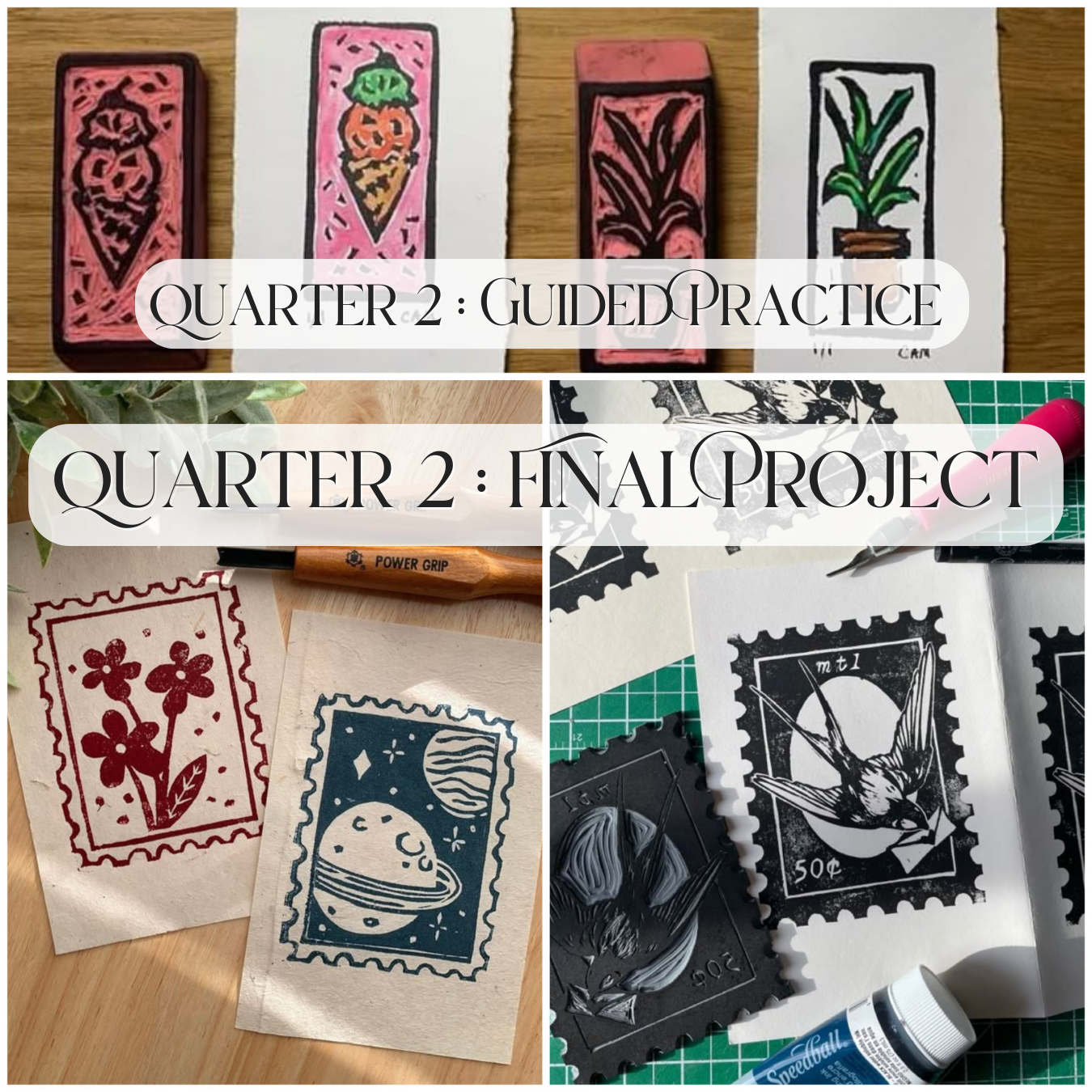 Final Project: A hand-carved stamp prints and a finished series of layered prints. Give them out to all your friends, or put them right in the trash! You're still going to be left with the skills you signed up for!