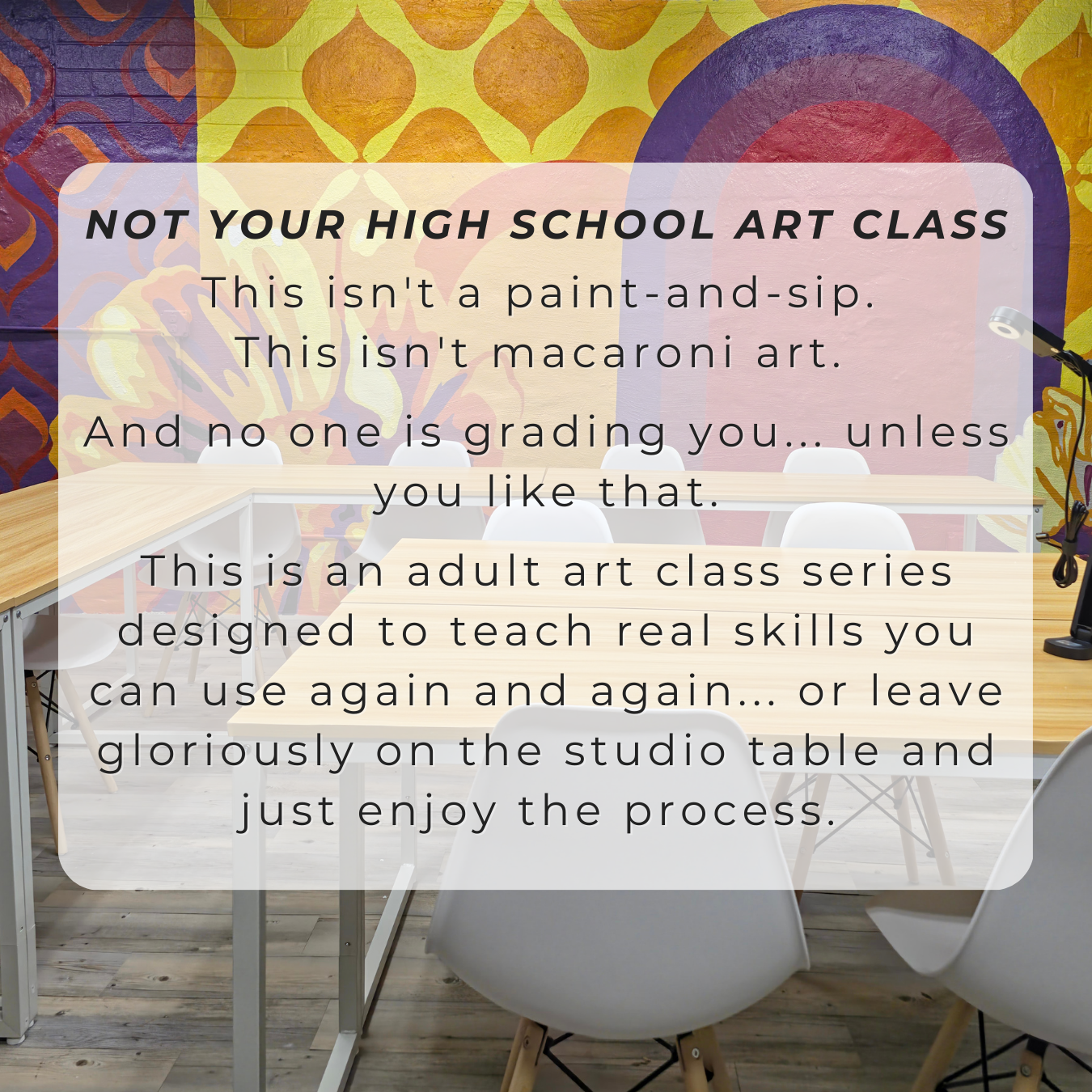 This is an adult art class series designed to teach real skills you can use again and again... or leave gloriously on the studio table and just enjoy the process.
